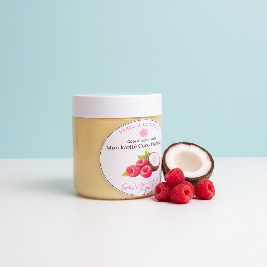 Les bienfaits du pur beurre de karité brut, non raffiné, associés au mariage coco + framboise…